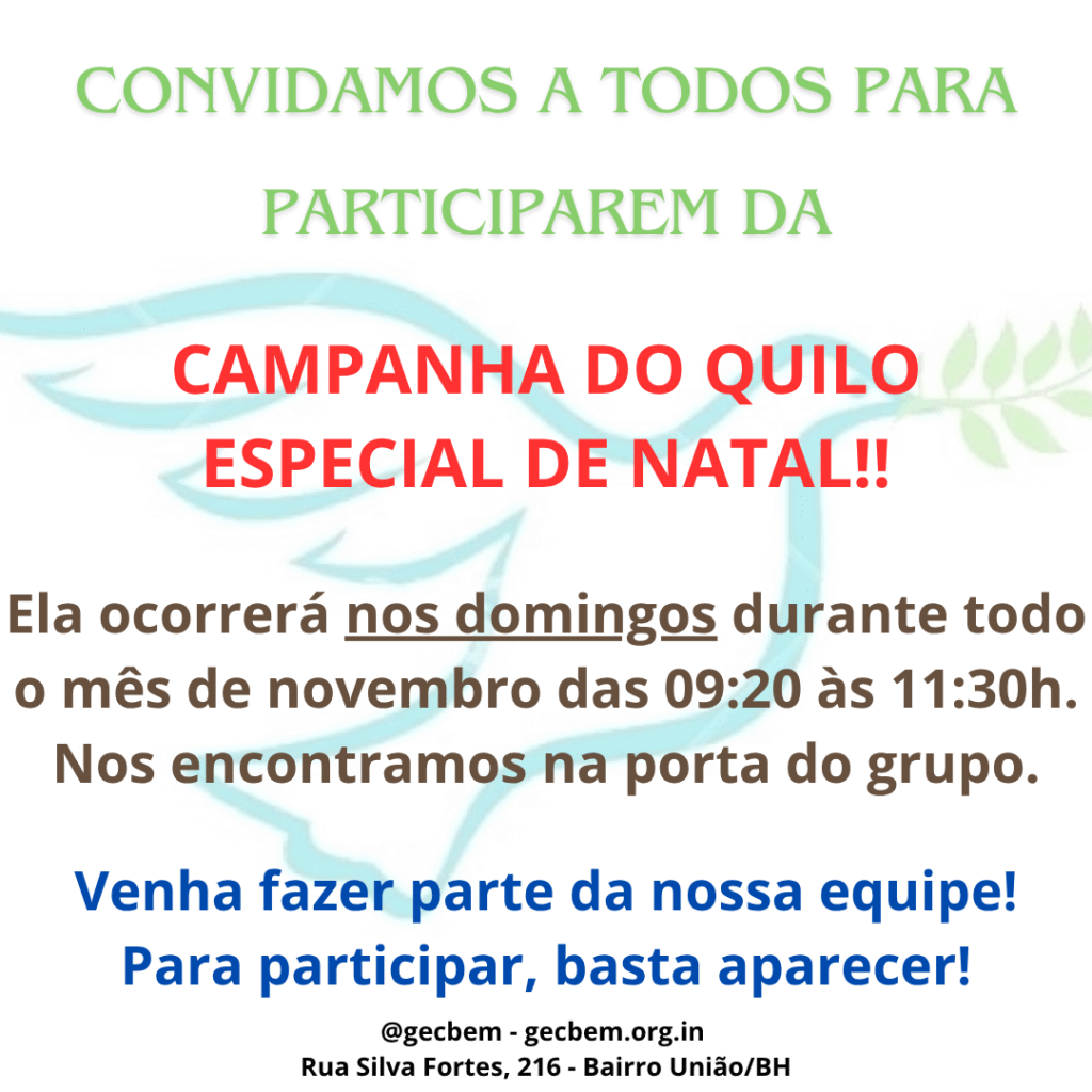 15:30 às 17h – Todo segundo sábado do mês é realizada a evangelização e distribuição de cestas básicas para as famílias cadastradas