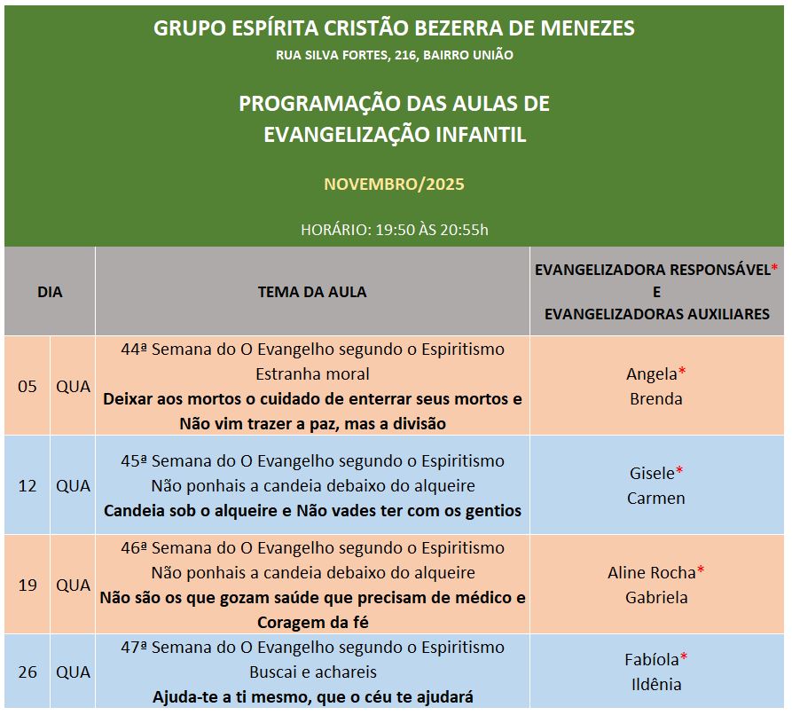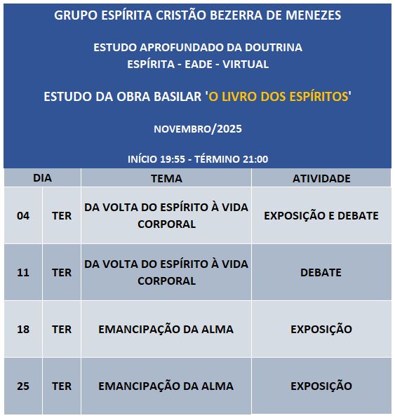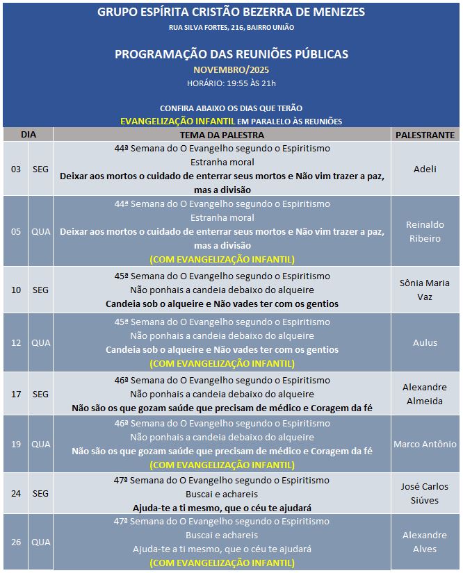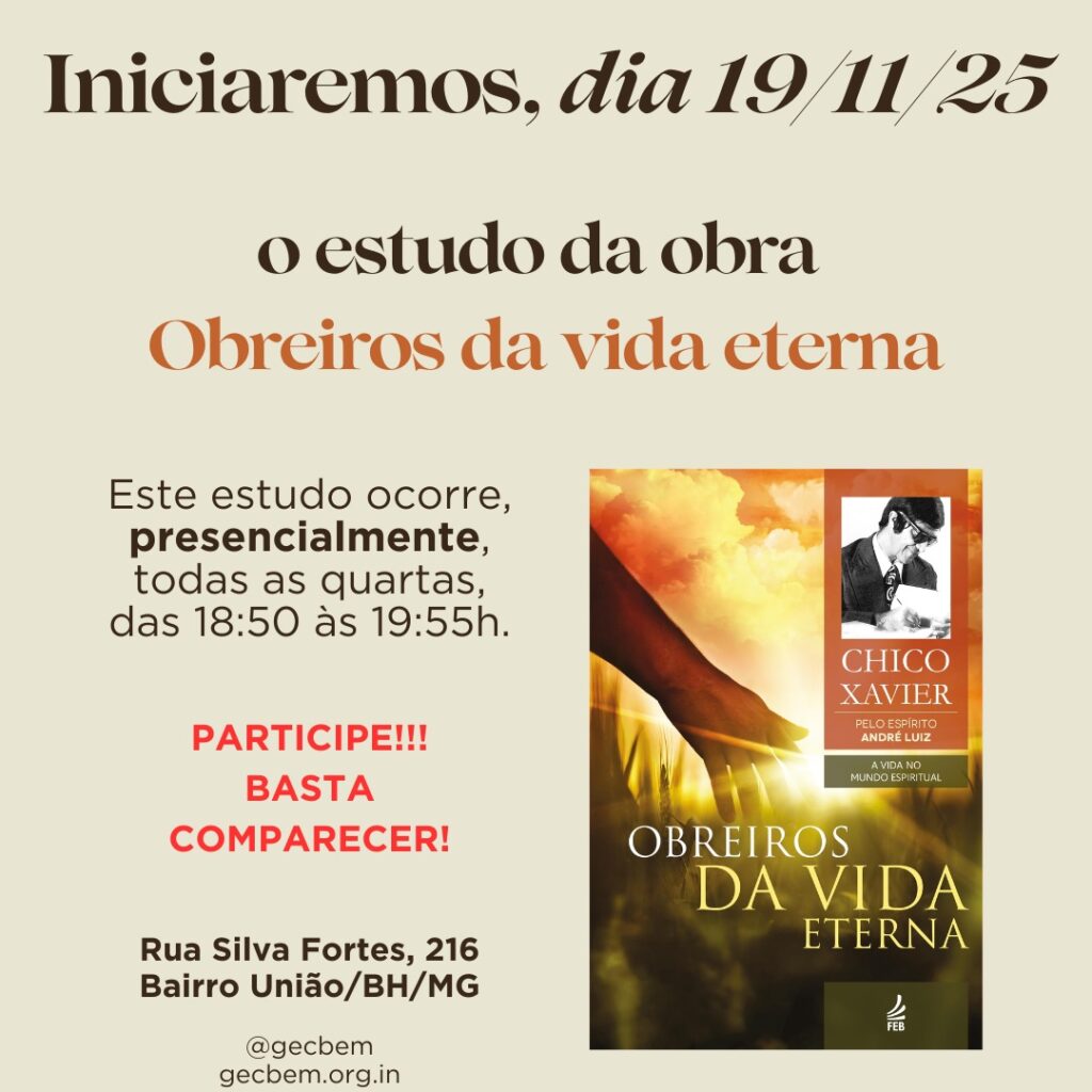 18:50 às 19:55h – Estudo do livro OBREIROS DA VIDA ETERNA (iniciado dia 19/11/2025 – Para participar, basta comparecer. Participe!!)